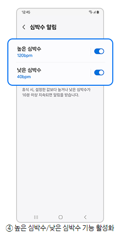 2단계) 심박수 알림 에서 높은 심박수, 낮은 심박수 알림을 설정하여 받아보세요.