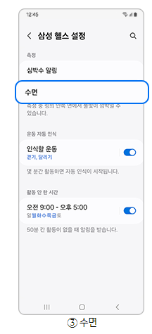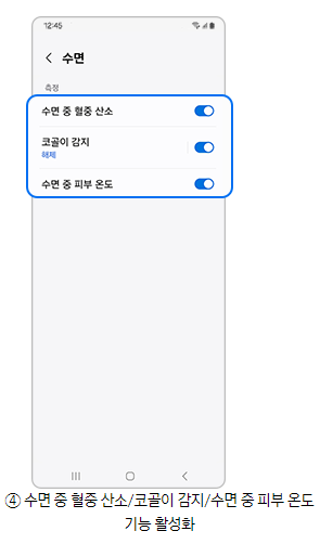 2단계) 수면에서 수면 중 혈중 산소, 코골이 감지, 수면 중 피부 온도 등 상세 측정 기능을 킨 후 수면을 측정해보세요.