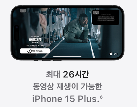 내장형 4383mAh Li-Ion 배터리를 장착한 아이폰 15 플러스는 하루 종일 사용 가능한 긴 배터리 수명을 자랑합니다. 동영상 재생 기준 최대 26시간의 배터리 성능을 제공합니다. 또한 USB Power Delivery 3.0과 MagSafe를 활용한 고속 충전 및 무선 충전을 지원합니다.