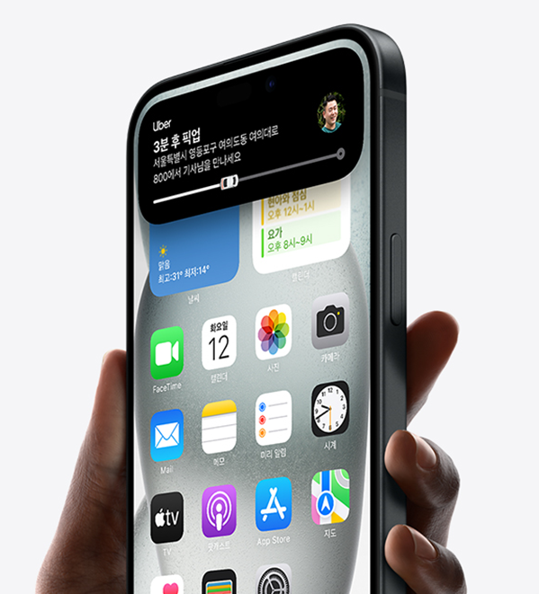 Dynamic Island는 화면 상단의 펀치홀 디자인을 활용해 알림, 실시간 활동 및 백그라운드 앱 정보를 깔끔하고 역동적으로 표시합니다. 이 기능은 사용자가 앱 간 전환이나 정보를 빠르게 확인할 수 있도록 돕습니다.