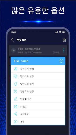 V3 Converter를 통해 비디오를 손쉽게 오디오로 변환하세요. 앱을 실행한 후 변환하고 싶은 비디오 파일을 선택하고, "MP3로 변환" 버튼만 누르면 끝입니다. 변환된 오디오 파일은 벨소리, 알람, 알림으로도 설정할 수 있으며, 편집 기능을 통해 원하는 부분만 잘라 사용할 수도 있습니다.