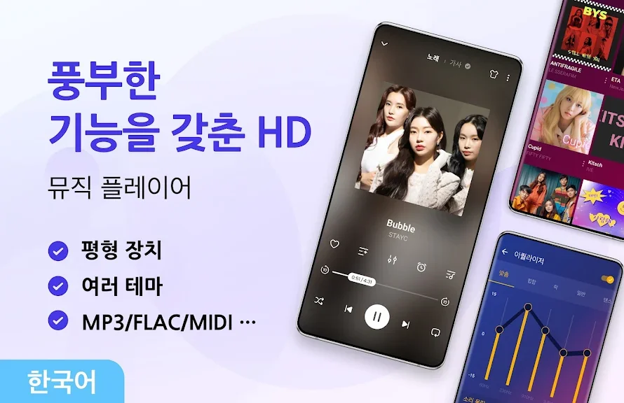 스마트폰에 저장된 음원과 스트리밍 음원을 한 곳에서 관리하고, 원하는 곡들을 하나의 재생목록으로 묶어 감상할 수 있습니다. 직관적인 인터페이스 덕분에 손쉽게 플레이리스트를 정리하고 다양한 음향 효과를 적용할 수 있습니다.
