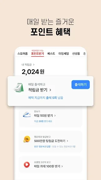용돈 봉투, 출석체크, 만보기, 행운번호 등 다양한 포인트 혜택이 가득해요~