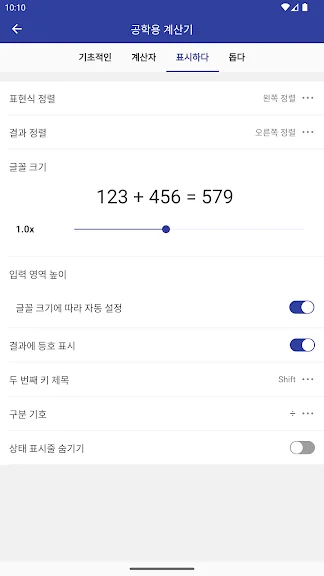 계산기에는 전체 화면 모드, 소수점 및 천 단위 구분 기호 등을 관리하기 위한 다양한 설정이 있습니다.