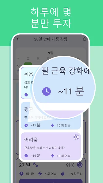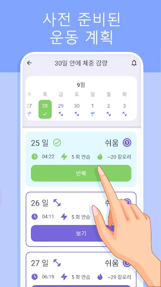 이 앱의 가장 큰 장점은 하루 2~7분이면 끝나는 빠른 운동입니다. 사무실에서, 침대 위에서, 집 한 켠에서 누구나 쉽게 따라 할 수 있어요. 짧은 시간 동안 집중적으로 운동하며 지방 연소를 도와줍니다.