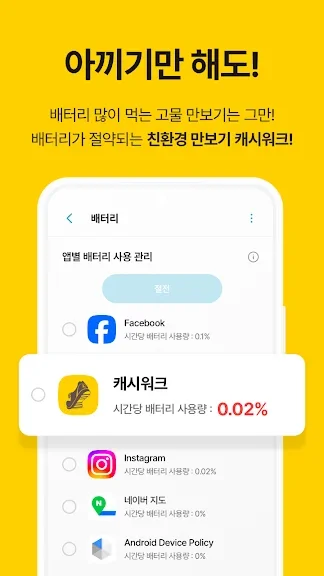 혹시 배터리가 많이 소모되는 고물 만보기를 사용하고 계신가요? 지금 배터리 걱정 없는 친환경 만보기 캐시워크를 사용해보세요!