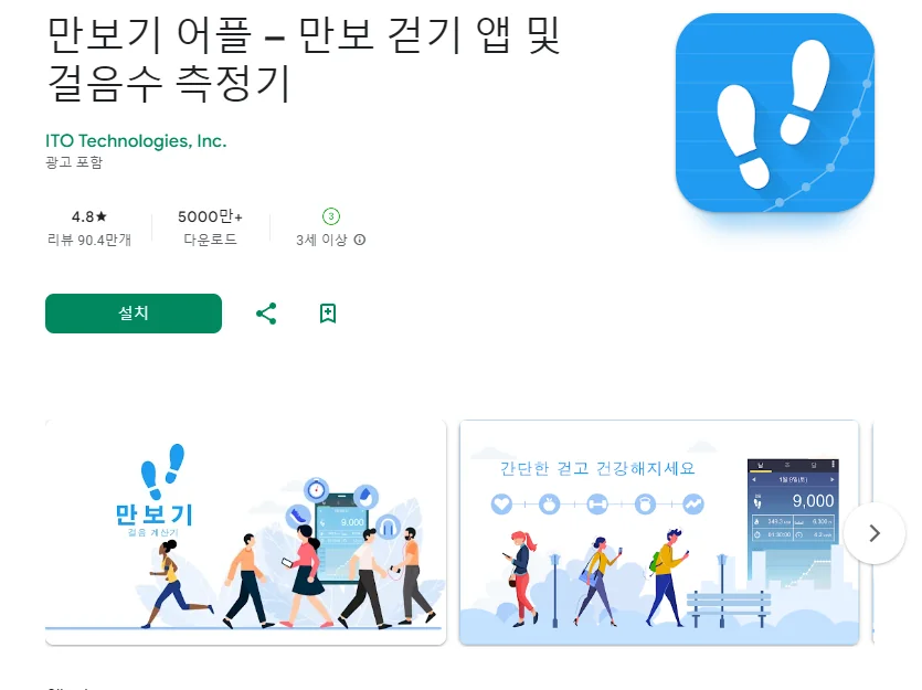 이 어플은 구글플레이스토어에서 "만보기"로 검색했을때 4번째로 나오는 어플입니다. 아래는 만보기 어플 – 만보 걷기 앱 및 걸음수 측정기 어플에 대한 자세한 설명이니 참고하세요.