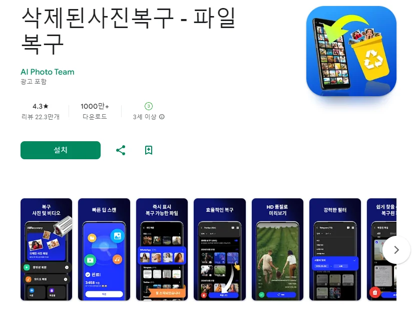 이 어플은 구글플레이스토어에서 "사진 복구"로 검색했을때 3번째로 나오는 어플입니다. 아래는 삭제된 사진 복구, 파일 복구, 모두 복구 어플에 대한 자세한 설명이니 참고하세요.