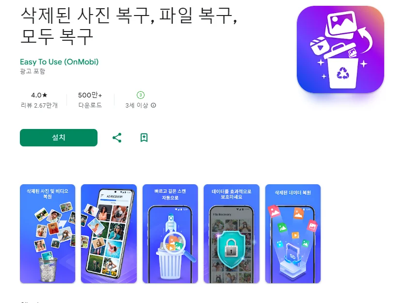 아래는 삭제된 사진 복구, 파일 복구, 모두 복구 어플에 대한 스크린샷 정보입니다.