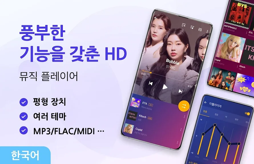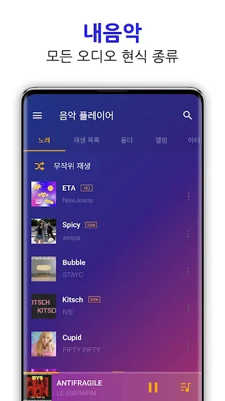 뮤직 플레이어는 단순한 MP3 플레이어가 아닌 MP3, MIDI, WAV, FLAC, AAC, APE 등의 모든 음악 및 오디오 형식을 지원하며 고품질로 재생합니다.