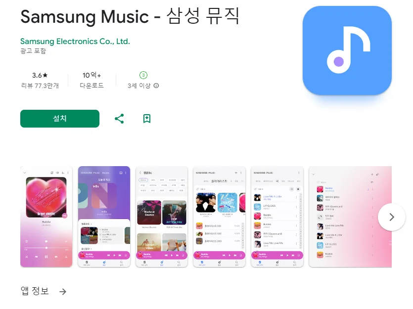 이 어플은 구글플레이스토어에서 "음악 플레이어"로 검색했을때 1번째로 나오는 어플입니다. 아래는 Samsung Music - 삼성 뮤직 어플에 대한 자세한 설명이니 참고하세요.