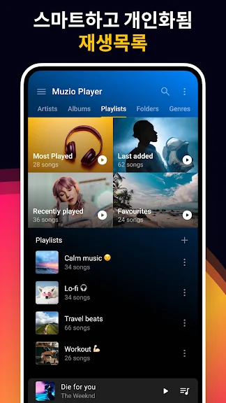 🎵 이 음악 플레이어를 사용하면 앨범, 아티스트, 재생 목록, 장르 및 폴더를 통해 번거로움 없이 음악을 탐색하고 재생할 수 있습니다!
