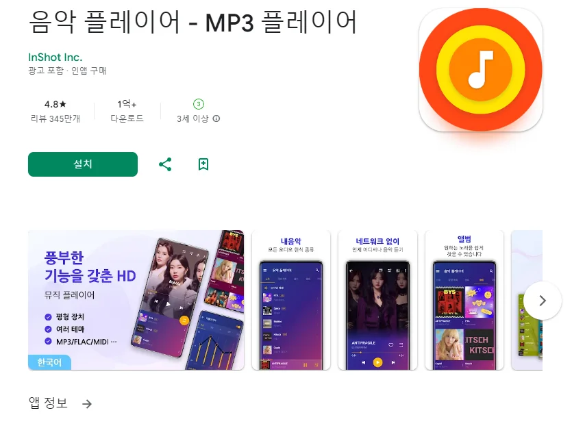 이 어플은 구글플레이스토어에서 "음악 플레이어"로 검색했을때 3번째로 나오는 어플입니다. 아래는 음악 플레이어 - MP3 플레이어 어플에 대한 자세한 설명이니 참고하세요.