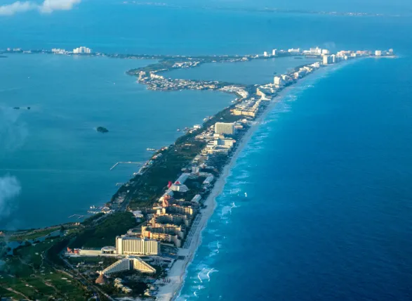 유카탄 반도의 북동쪽 해안에 위치한 L자 모양의 작은 섬은 관광객들에게 인기 있는 휴양지로 자리하고 있습니다. 이 섬은 남북으로 약 21㎞, 동서로 약 400m에 이르는 면적을 자랑하고 있습니다. 본토의 시와 이곳의 휴양지는 편의시설이 밀집된 둑길로 연결되어 있어 편리한 이동이 가능합니다.