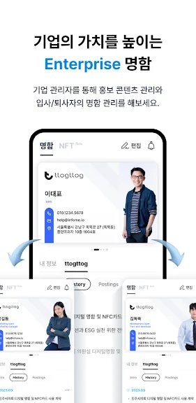 - 기업의 관리자가 콘텐츠 등록 시 소속된 모든 사용자의 명함에 자동으로 업데이트되어 관리 및 영업 효율이 향상됩니다.