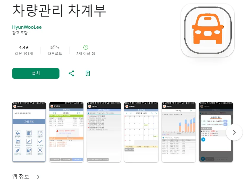 아래는 차량관리 차계부 어플에 대한 스크린샷 정보입니다.