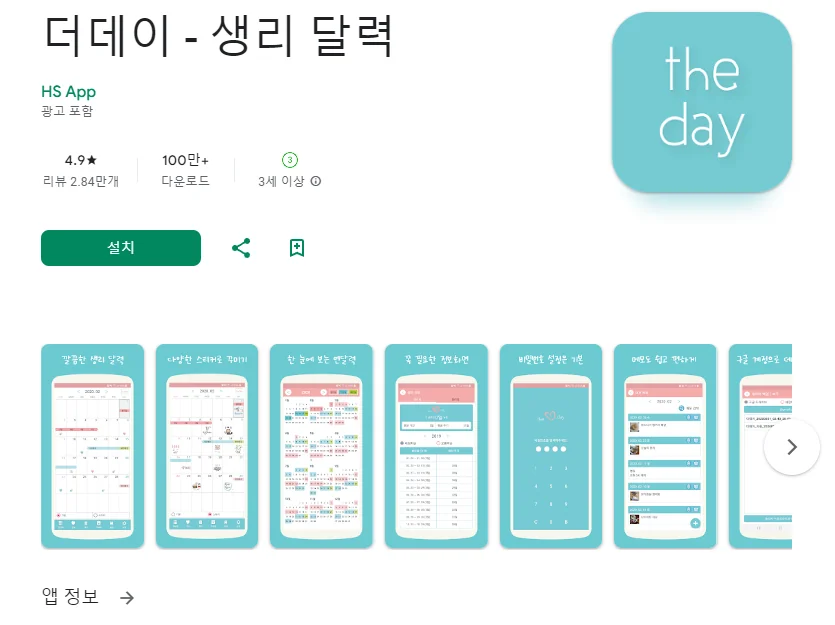 이 어플은 구글플레이스토어에서 "생리주기 계산"로 검색했을때 1번째로 나오는 어플입니다. 아래는 더데이 - 생리 달력 어플에 대한 자세한 설명이니 참고하세요.