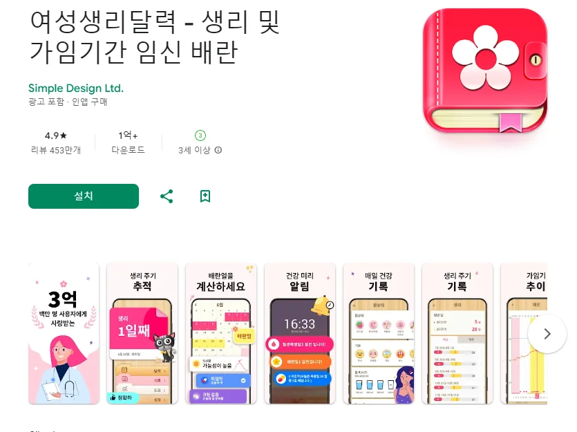 이 어플은 구글플레이스토어에서 "생리주기 계산"로 검색했을때 3번째로 나오는 어플입니다. 아래는 생리 달력 - 생리 주기 관리 어플에 대한 자세한 설명이니 참고하세요.