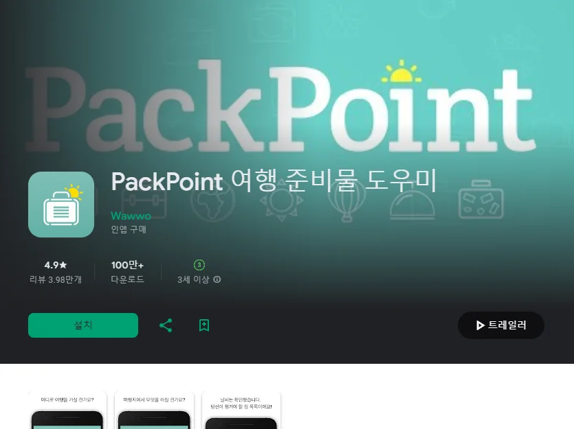 아래는 PackPoint 여행 준비물 도우미 어플에 대한 스크린샷 정보입니다.
