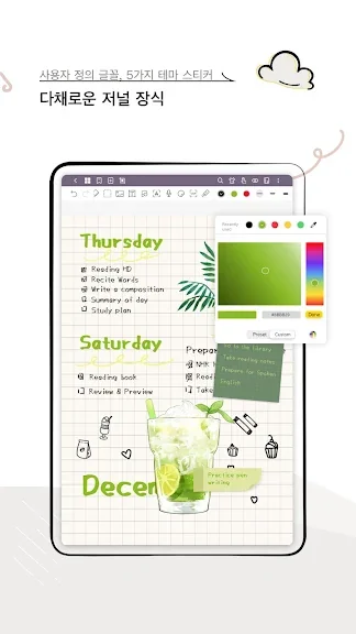 다양한 노트 커버를 지원하며, 템플릿을 추가하여 나만의 다이어리, 나만의 디지털 플래너를 작성할 수 있습니다.