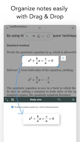 드래그 & 드롭 액션을 통해 다른 앱에서 텍스트, 이미지를 드래그 & 드롭으로 가져와, PDF와 노트에 추가할 수 있습니다.
