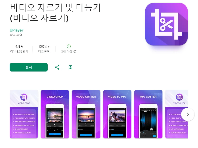 이 어플은 구글플레이스토어에서 "동영상 자르기"로 검색했을때 1번째로 나오는 어플입니다. 아래는 비디오 자르기 및 다듬기 (비디오 자르기) 어플에 대한 자세한 설명이니 참고하세요.