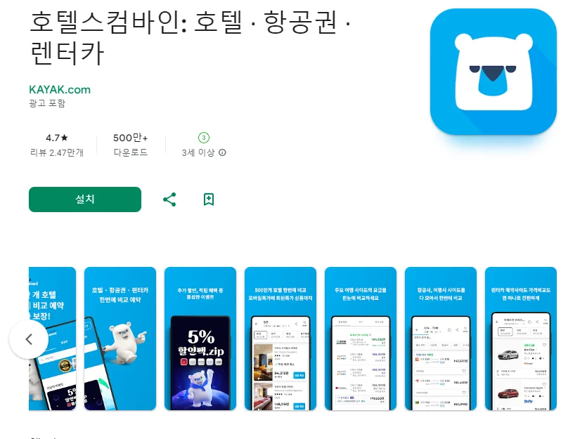 이 어플은 구글플레이스토어에서 "호텔 예약"로 검색했을때 5번째로 나오는 어플입니다. 아래는 호텔스컴바인: 호텔 ∙ 항공권 ∙ 렌터카 어플에 대한 자세한 설명이니 참고하세요.