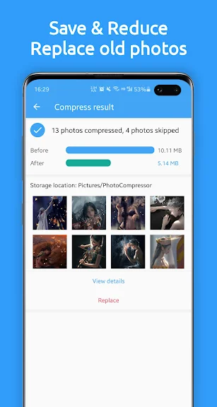 저희 앱을 사용하면 품질 저하 없이 이미지 크기를 줄일 수 있으므로 기기의 공간을 절약하거나 온라인으로 이미지를 공유하는 데 적합합니다. 지금 시도하고 차이점을 확인하십시오!