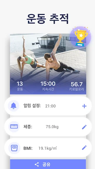 연소된 칼로리와 체중 감량 과정을 그래프로 확인할 수 있습니다. 헬스장에 갈 필요도, 장비도 필요 없어요. 그냥 체중을 이용하는 것만으로도 몸 전체를 탄력 있게 만들고 탄탄한 근육을 만들 수 있어요.