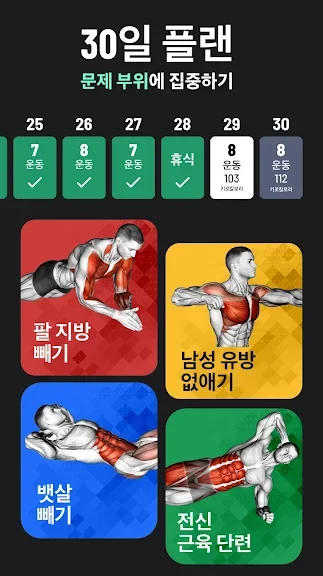 - 지방 감소 운동, 복근 운동, 가슴 운동, 다리 운동, 팔 운동, 뱃살빼기, 30일만에체중감량