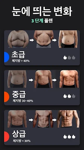 초보자 및 프로 모두를 위한 3 단계의 난이도가 있습니다. 전문 피트니스 코치가 디자인한 이 앱은 남성의 문제 부위, 배, 가슴을 집중 공격해 빠른 체중 감량 및 복근 만들기를 도와줍니다. 매일 다른 운동으로 쉽게 따라할 수 있습니다.