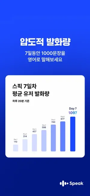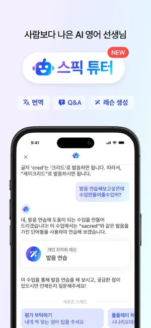 스픽은 현존하는 가장 빠르고 정확한 음성 인식 기능과 인공지능 기술을 활용한 영어 학습 앱으로, 기존에 없던 영어 회화 학습법을 선보입니다.