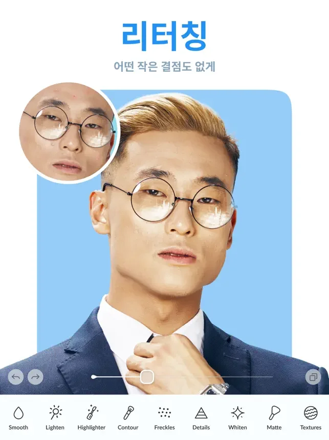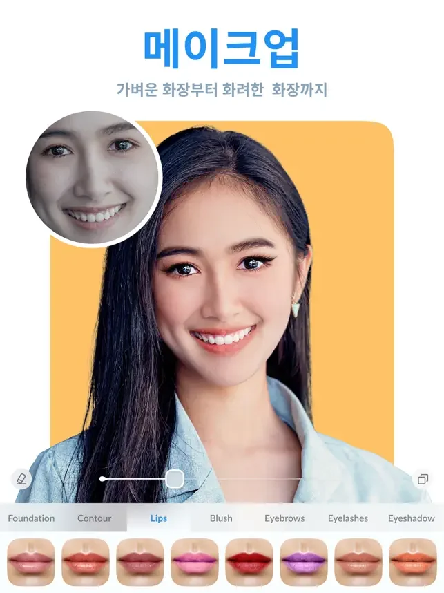 이 간편한 리터치 툴만 있으면 누구나 사진작가가 되어, 스스로에게서 최고의 모습을 끌어낼 수 있습니다. 피부를 매끈하게 만들고, 이를 하얗게 하고, 얼굴형을 수정하고, 잡티와 주름을 제거하고, 키를 키우고, 화장이나 문신, 근육 및 필터를 추가해 보세요.