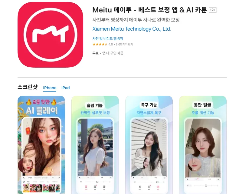 아래는 아이폰 Meitu 메이투 - 베스트 보정 앱 & AI 카툰 어플에 대한 자세한 설명입니다. 참고하세요.