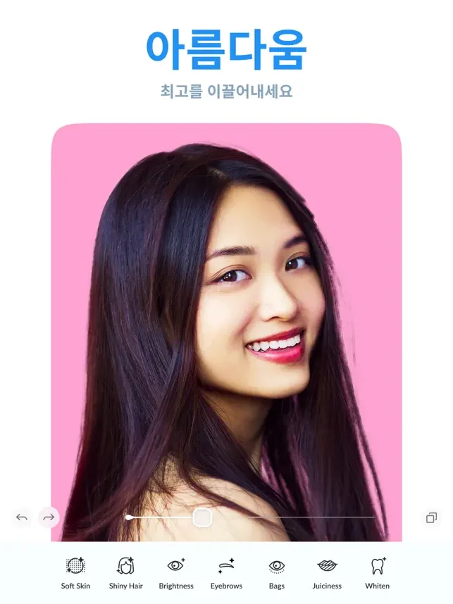● 얼굴 볼륨, 다양한 피부톤 조정, 앞머리 및 치아 사진보정 기능을 활용하여 사진을 한결 더 자연스럽고 아름답게 만드세요!