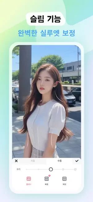 ● 슬림 - 얼굴도 몸매도 자유롭게 수동으로 보정. 사진왜곡 걱정 없는 복구 기능