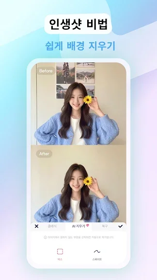 - AI 배경 삭제: 사진에서 원하지 않는 배경을 클릭 한 번으로 쉽게 제거하여 사진의 배경을 깔끔하게 변경할 수 있습니다.