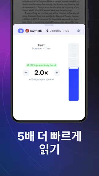 고품질 Al 음성은 평균 읽기 속도보다 4.5배 더 빠르게 읽을 수 있으므로 더 짧은 시간에 더 많은 것을 배울 수 있습니다. 분당 300단어부터 시작해서 원하는 만큼 속도를 천천히 높여보세요.