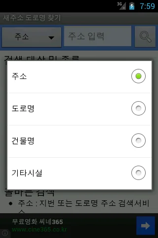 아래는 새주소 도로명 찾기 어플에 대한 스크린샷 정보입니다.