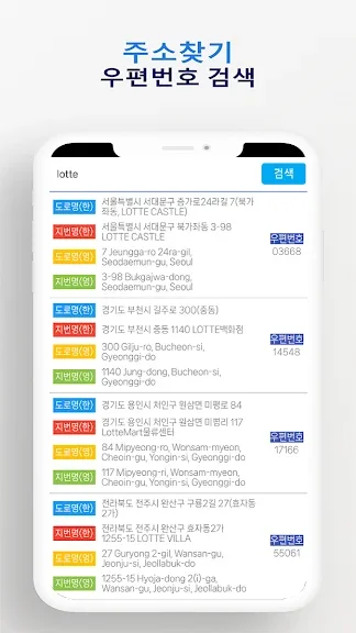 주소/우편번호 찾기 (도로명, 지번, 영문, 우편번호) 어플에 대한 스크린샷 정보가 필요하시다면 아래 이미지를 참고하시기 바랍니다.