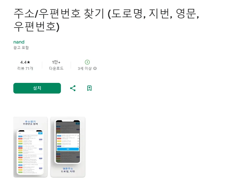 이 어플은 구글플레이스토어에서 "주소 찾기"로 검색했을때 1번째로 나오는 어플입니다. 아래는 주소/우편번호 찾기 (도로명, 지번, 영문, 우편번호) 어플에 대한 자세한 설명이니 참고하세요.
