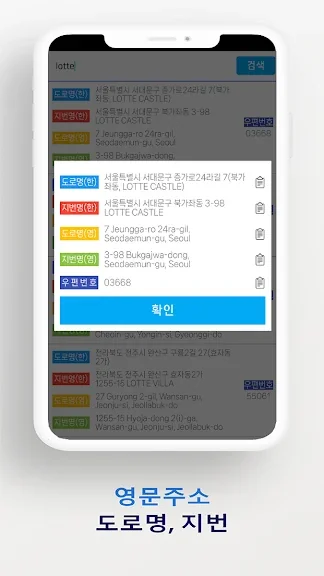 2) 주소/우편번호 찾기 (도로명, 지번, 영문, 우편번호) 어플 스크린샷