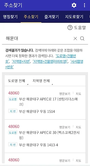 - 한글 주소로 영문 주소를 찾을 수 있습니다.