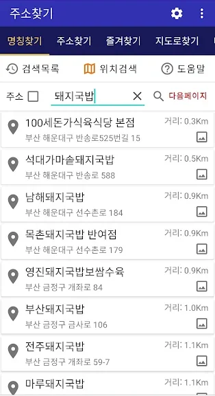 - 위치기반 주소 검색을 할 수 있습니다. 현재 위치에서 가까운 순서대로 검색됩니다.