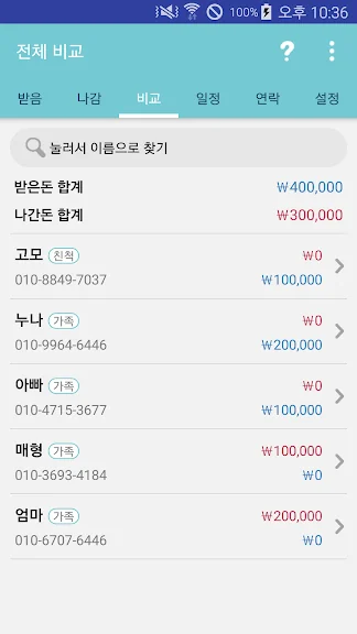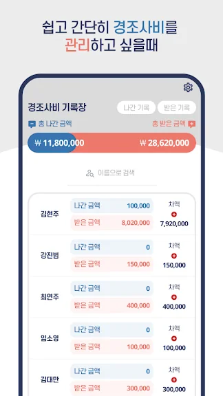경조사에 받은 금액을 정확히 기록하고, 사람별로 비교할 수 있어 서운함 없이 받은 만큼 돌려줄 수 있습니다.