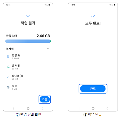 | ※ 연락처 백업 시 삼성 계정, 구글 계정, SIM 카드 내 연락처가 백업되며, 그 외 외부 계정은 백업되지 않습니다. | |