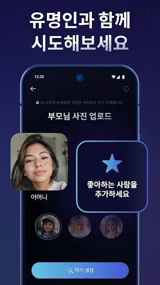 ✔️ 유명인 얼굴 매칭: 유명한 인물과 함께 미래 아기를 예측해보세요. 유명인 사진을 업로드하여 다양한 조합을 시도할 수 있습니다.