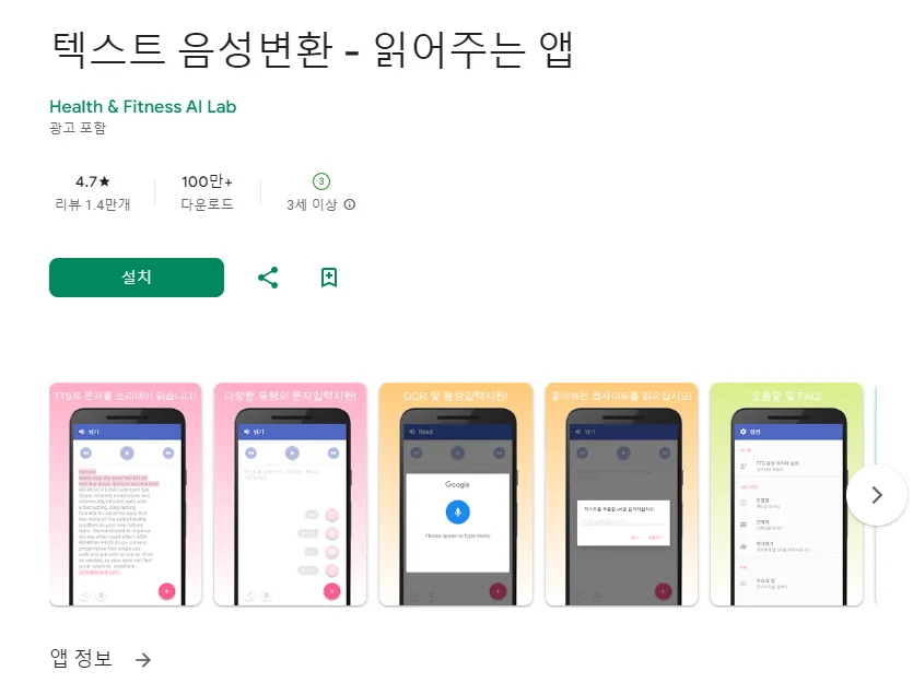 이 어플은 구글플레이스토어에서 "텍스트 읽어주는"로 검색했을때 1번째로 나오는 어플입니다. 아래는 텍스트 음성 변환 어플에 대한 자세한 설명이니 참고하세요.