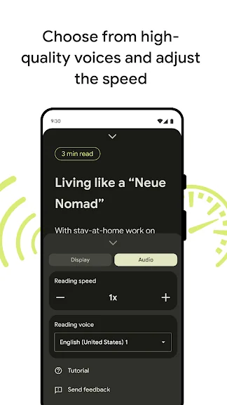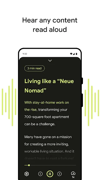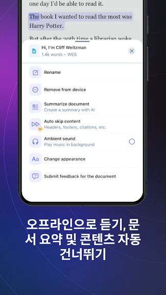 • 텍스트 음성 변환: 버튼을 터치하여 글로 작성된 콘텐츠를 음성으로 듣습니다. 길이가 긴 형식에 맞는 다양한 고품질 음성 중에서 선택합니다. 이용 중 되감기, 빨리 감기, 읽기 속도 변경 등 오디오 제어 옵션에 간편하게 액세스할 수 있습니다.