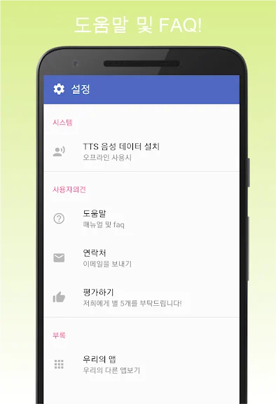 * 오프라인에서 사용하려면 TTS (text-to-speech) 음성 데이터를 미리 설치해야합니다. 설정 탭으로 이동하여 "TST 음성 데이터 설치"를 클릭하십시오. 그런 다음 원하는 특정 TTS 음성을 다운로드 할 수 있습니다.